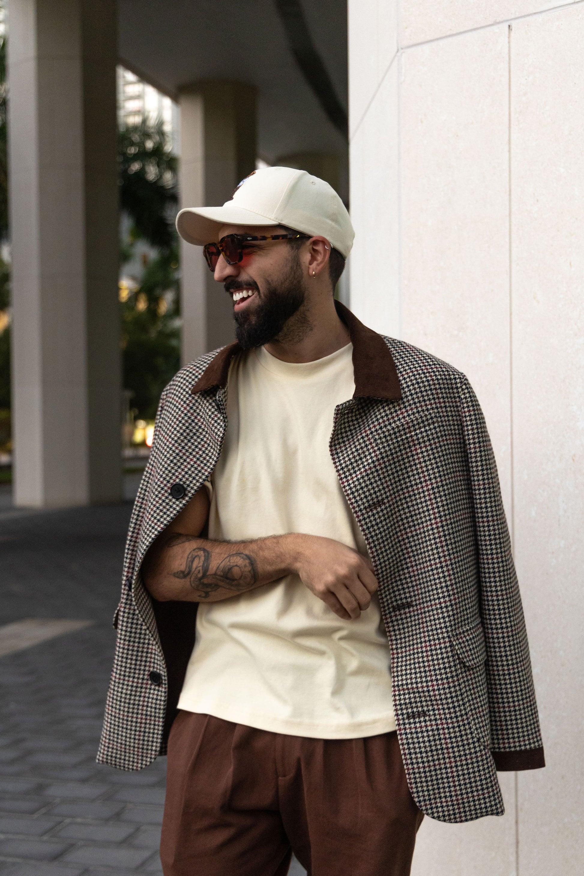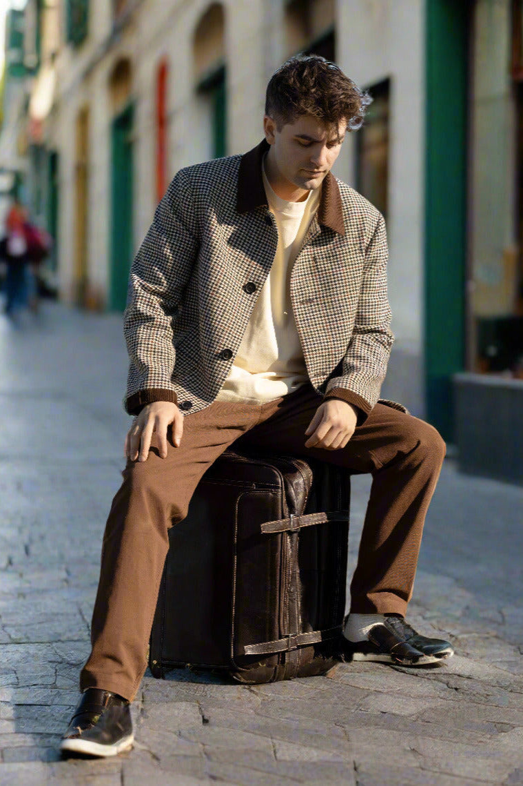 Made with premium Australian wool, the Elevated Chore Coat blends the durability and timeless silhouette of the traditional chore coat with luxurious materials and elevated design details. Featuring a houndstooth pattern in beige, brown, and navy, contrasted collar and cuffs in rich brown corduroy, and finished with natural horn buttons, this jacket adds sophisticated touches to classic workwear.